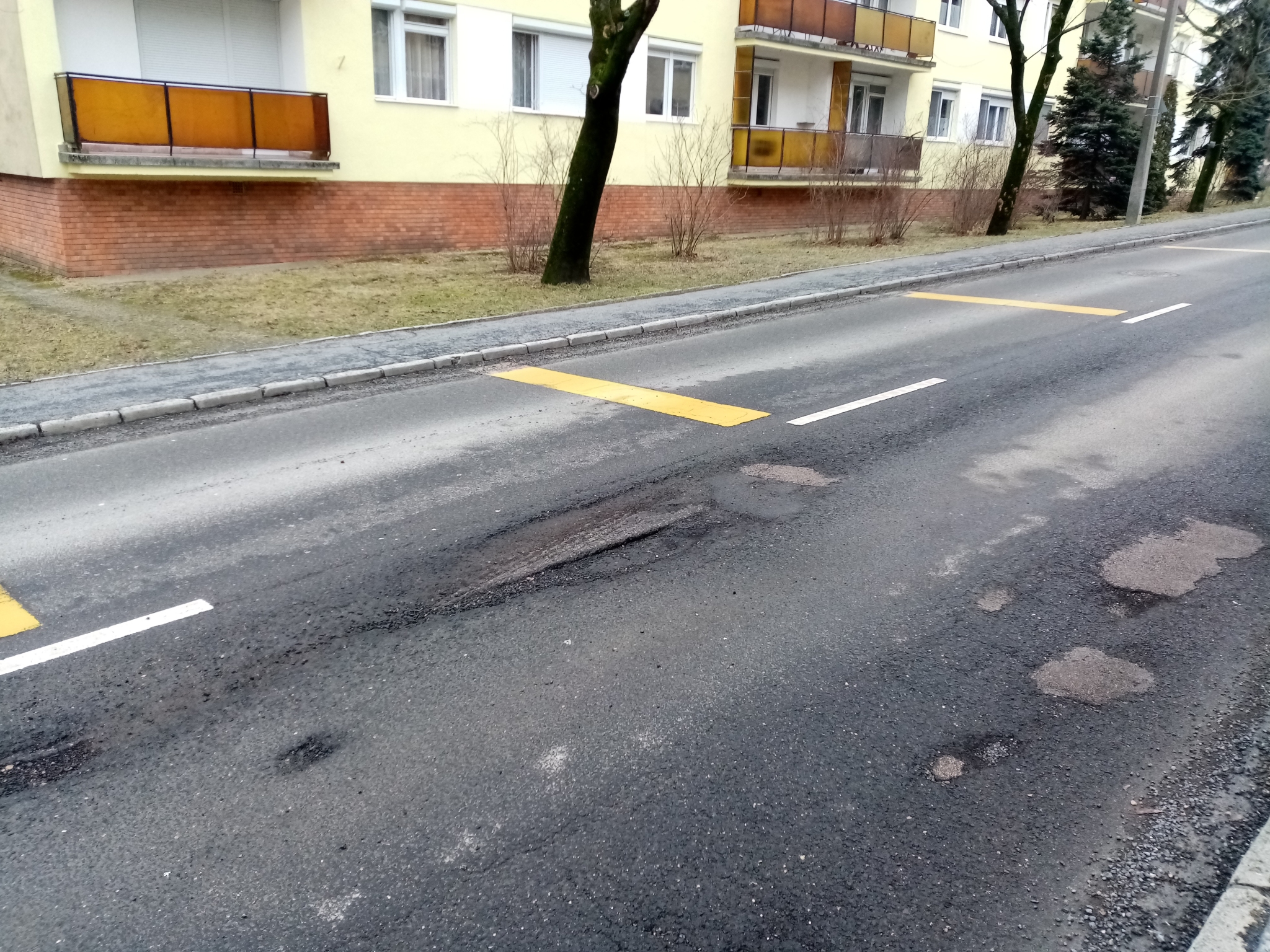 Veszprémben az Egyetem utca 27. szám előtt az úttesten egy hosszú, mély kátyú van.