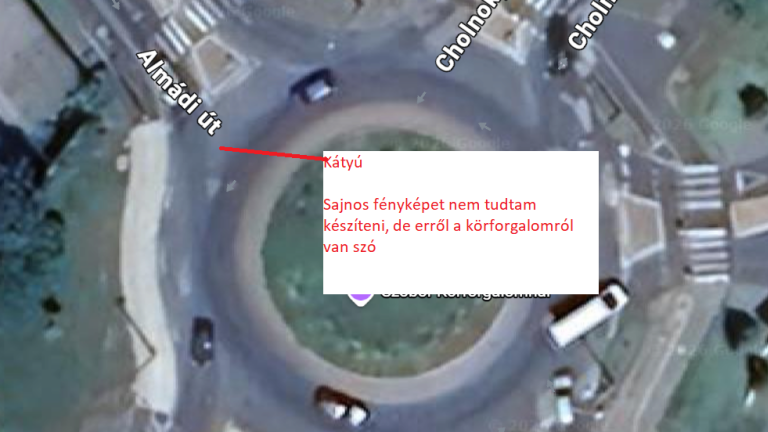 Veszprémben a Cserepes utca és Almádi út körforgalmában egy mély kátyú van.