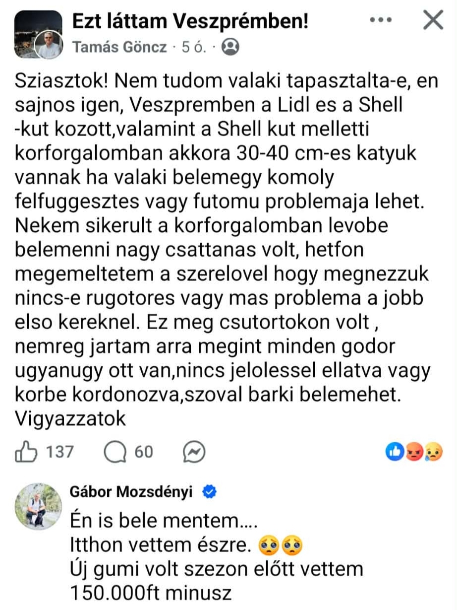 Új hatalmas kátyúk lettek a Cholnoky Lidl-Shell benzinkút között és a körforgalomban.