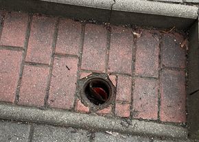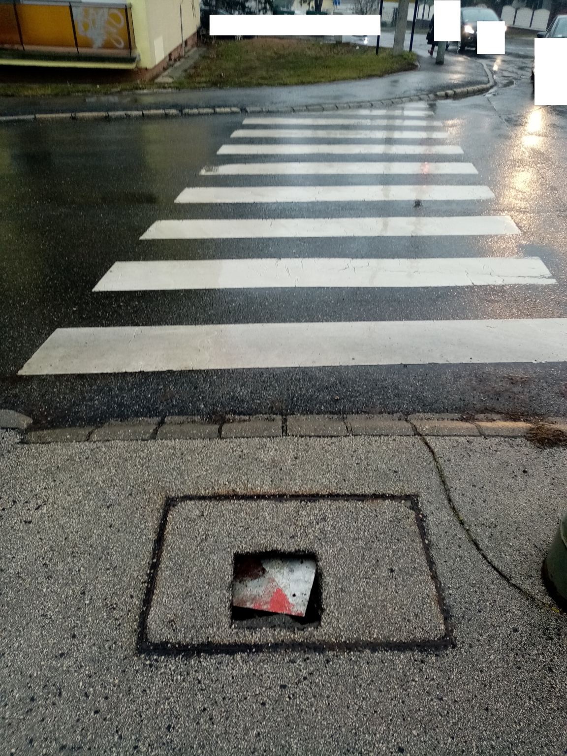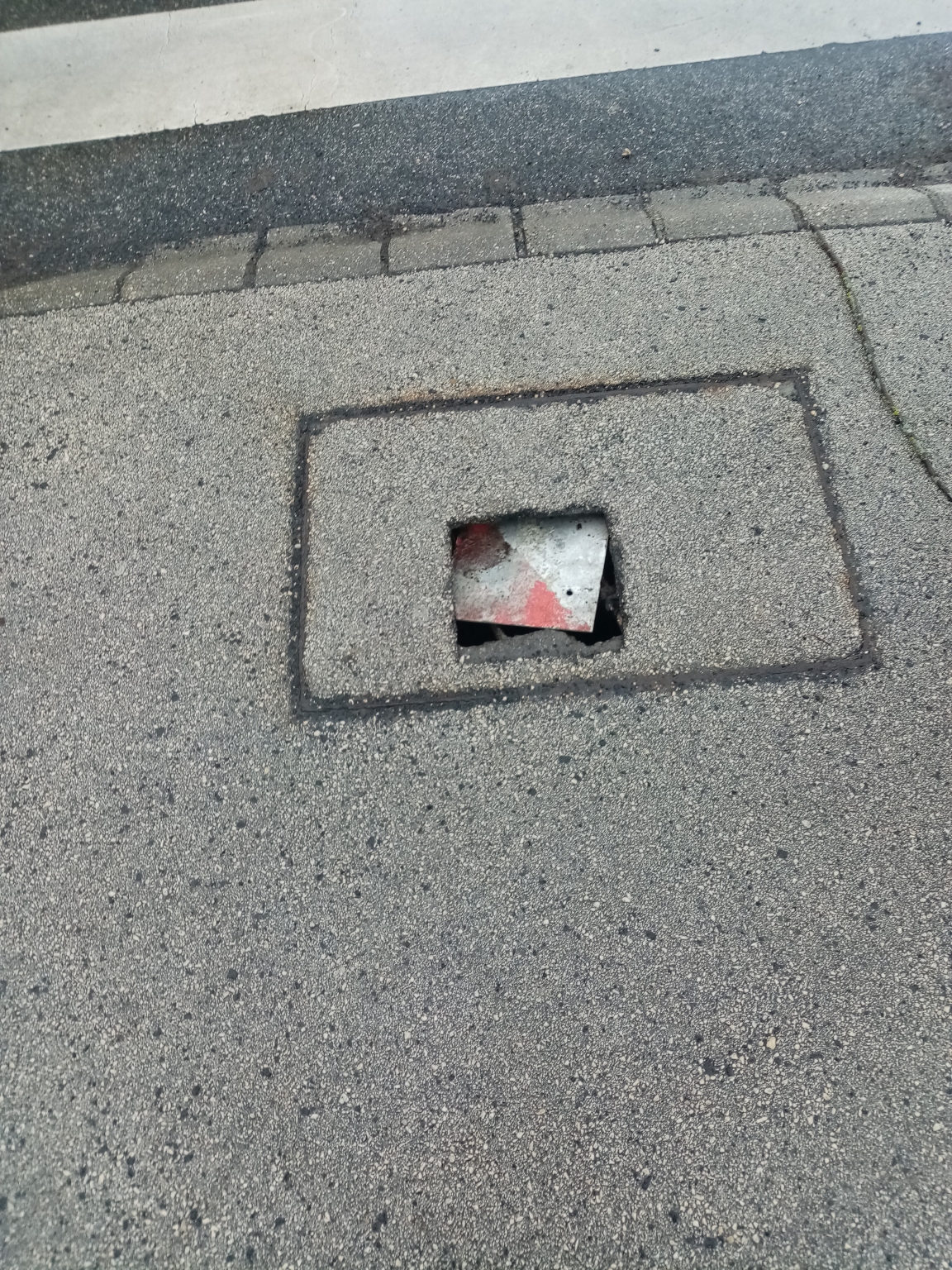 Veszprém, Stadion utca - Egyetem utca sarkánál a járdaszigeten sérült aknafedél. Beszakadt, balesetveszélyes.
