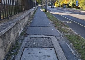 A Diósy Márton utca esővíz elvezető csatorna tetői az utca jobb oldalán teljesen el vannak tömődve, illetve be vannak süllyedve az útba.