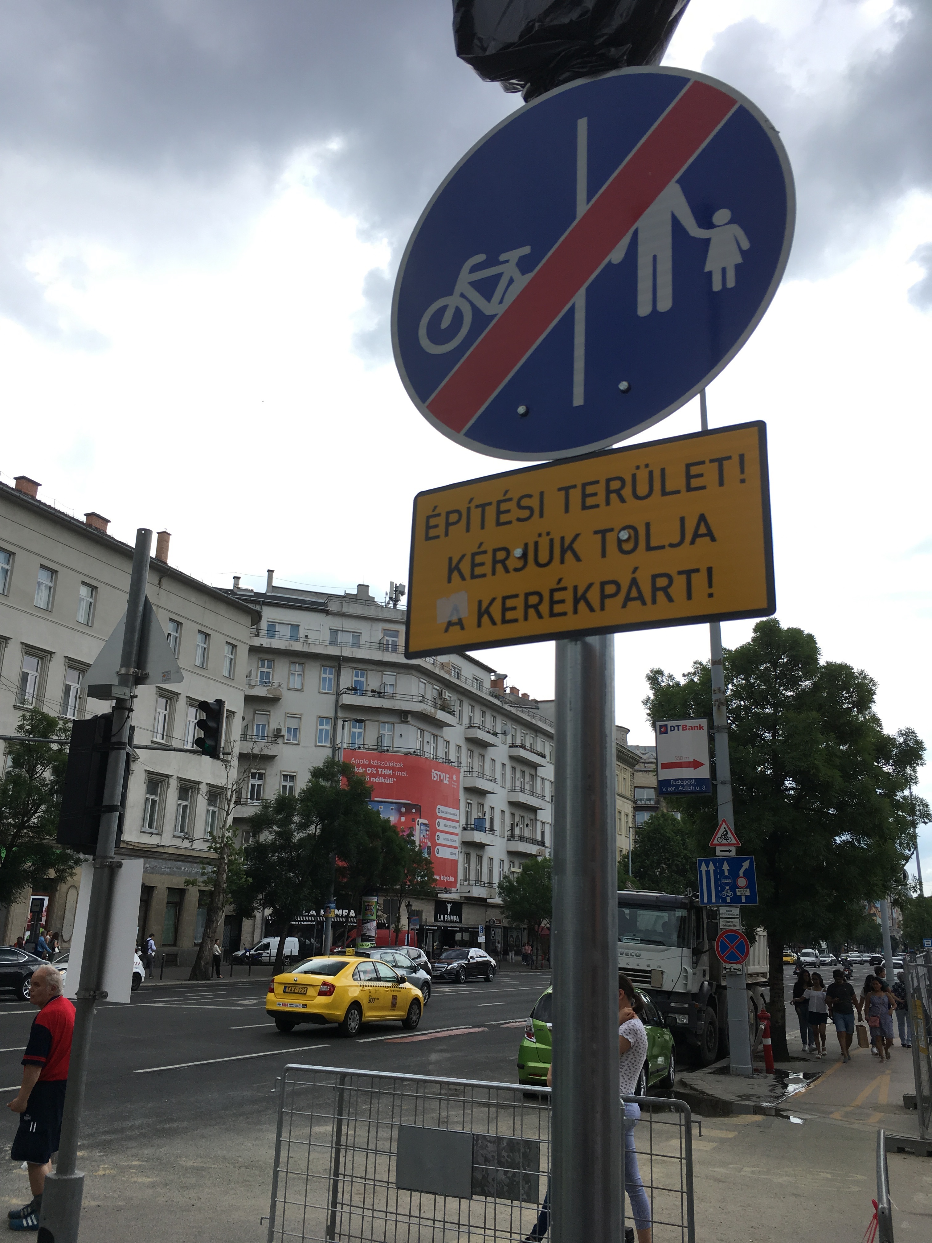 A pedáns gyalogosútvonal kijelölés mellett pláne feltűnő, hogy a bicikliút pótlásával már nem volt ilyen nagyvonalú a kivitelező. A város egyik legforgalmasabb bringás útvonalát pedig éppen “kettévágja” ez a beruházás. És bár dicséretes, hogy a végcél éppen az, hogy a biciklis közlekedés is kényelmesebb és biztonságosabb legyen, egyelőre mindezért súlyos árat kell fizetni. Mindössze annyival látták jónak elintézni a helyzetet, hogy kiraktak egy táblát: ezen a részen mindenki szálljon le és tolja inkább a járgányt.