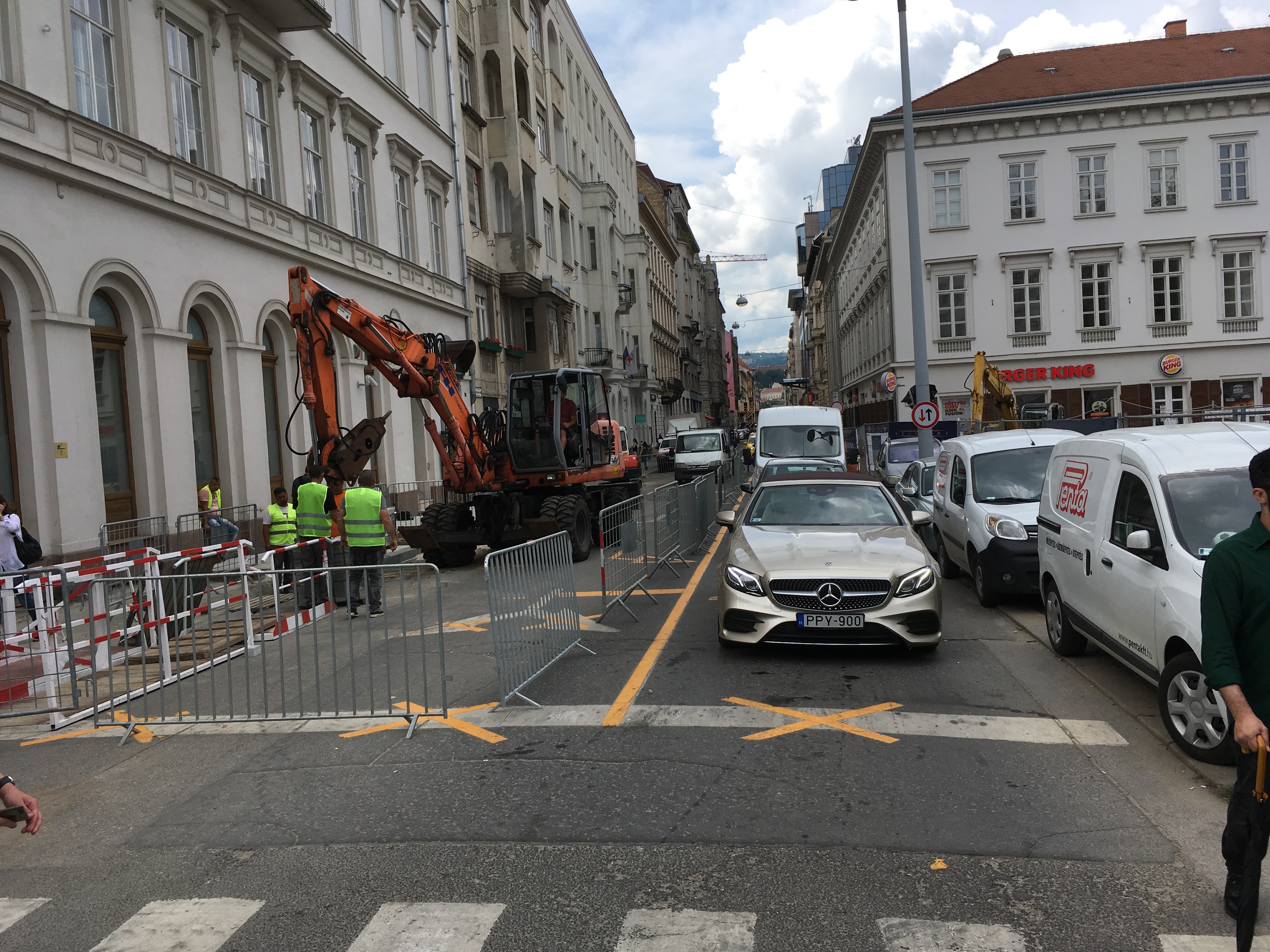 Elsőre tehát úgy tűnhet, hogy kivételesen nem a gyalogosok, hanem sokkal inkább az autóval közlekedők és a kerékpárosok számára necces az ideiglenes állapot. Az Arany János utca egyik sávját ugyanis lezárták. Amíg tart a felújítás, munkagépek várakozhatnak ott. A közeli boltok áruforgalmát így nehéz lesz erről a frontról megoldani, ekkora mennyiségű autó mellett pedig szinte garantált a folyamatos dugó ezen a szakaszon.