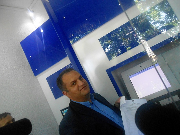 Shpend Ahmeti főpolgármester és az 1 eurós nyomtatvány. Fotó: kk.rks-gov.net
