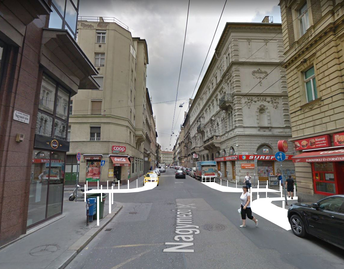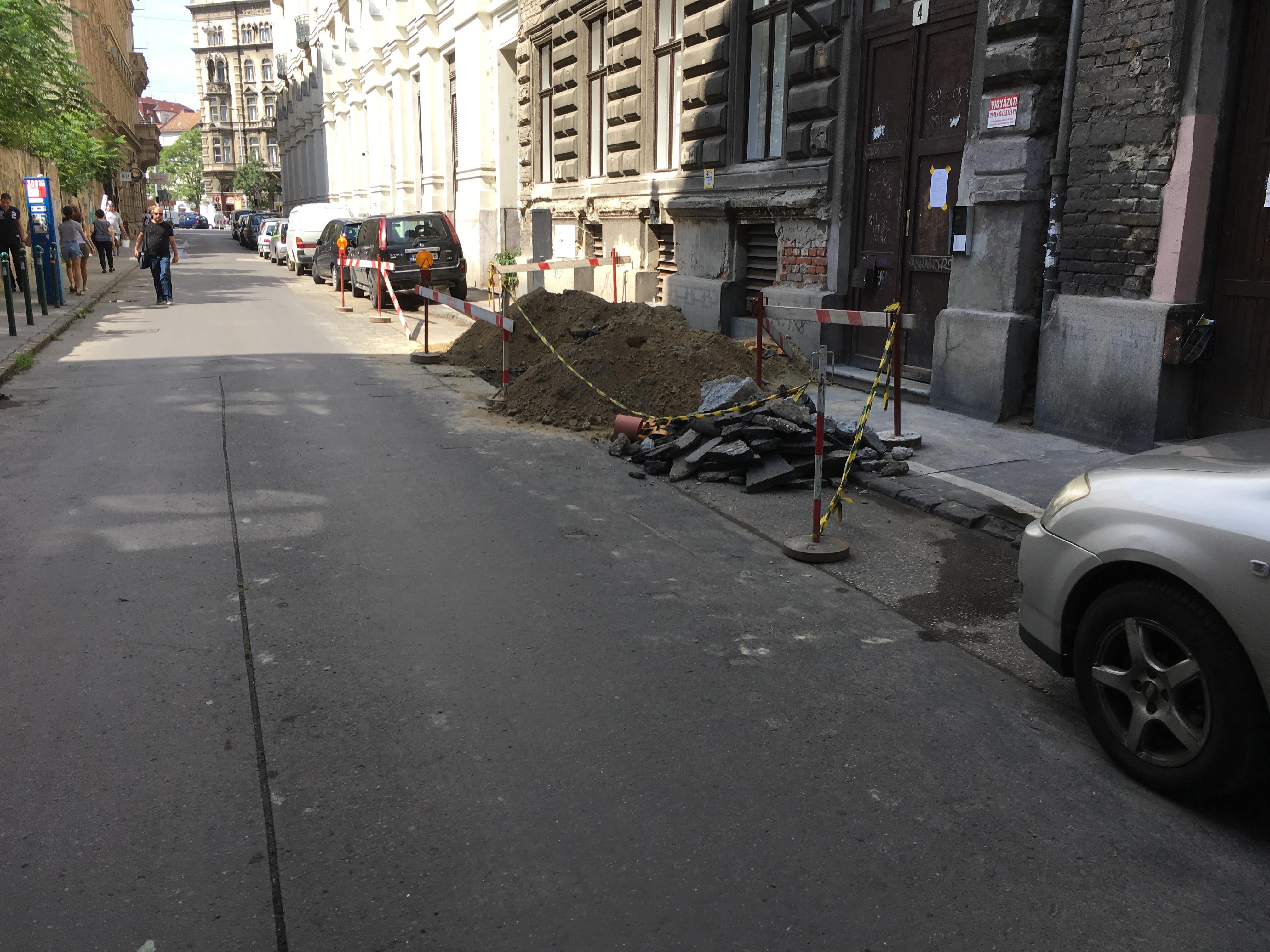 A járókelők jobb híján az úttesten lődörögnek. A sarkon túl végül a felújítás alatt álló Podmaniczky tér látványa koronázza meg az élményt.