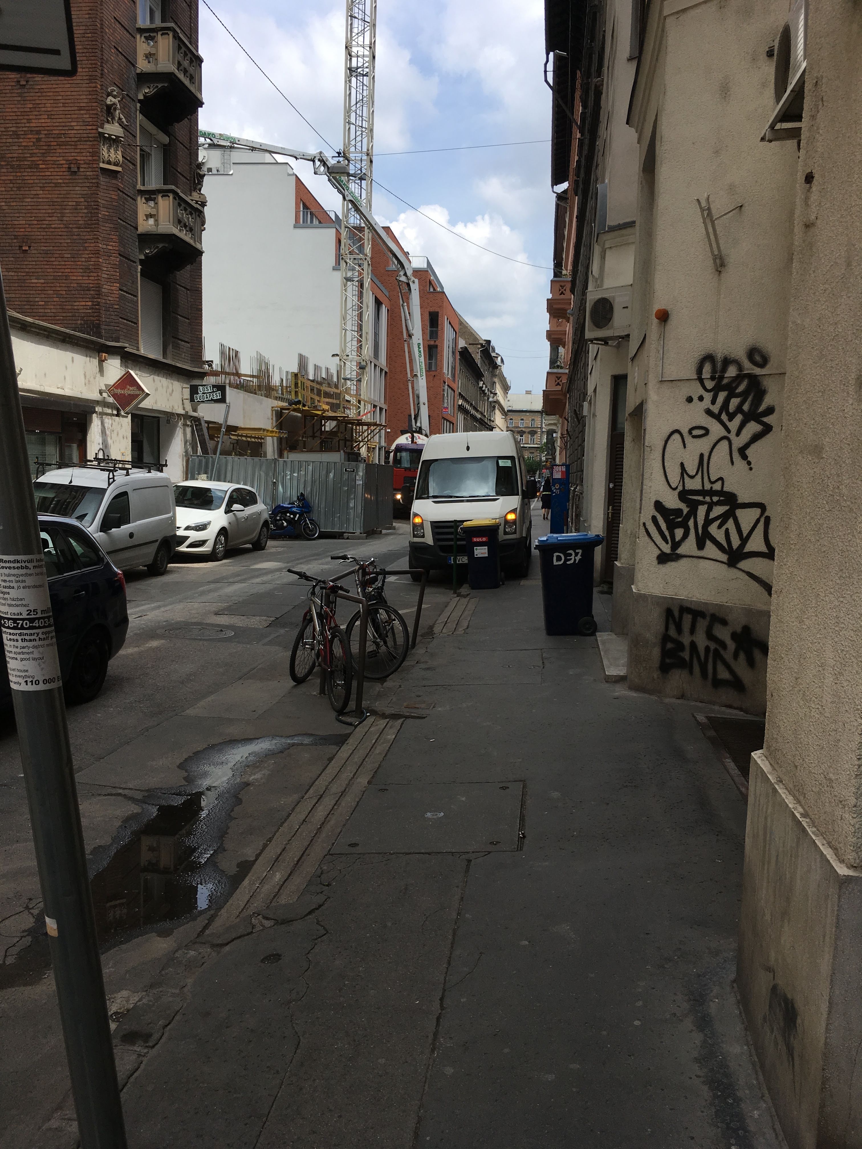 A Teréz körút felől indulva rögtön az első sarkon egy betonkeverőbe botlunk. Az utcában két nagyobb beruházás is zajlik, ez az egyik. A két építkezés közötti szakaszon pedig a Nagymező utca szeli ketté a Dessewffyt. Arról, hogy ez miért problémás, elég pontosan tudósít egy a Járókelőre érkezett korábbi bejelentés.